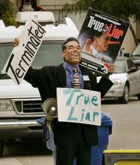Poco antes de la llegada del gobernador de California Arnold Schwarzenegger al centro de votaci�n el distrito de Brentwood, en Los Angeles, un individuo protest�ntra la pol�ca del gobernante, que ayer someti�referendo cuatro controvertidas iniciativas de ley FOTO Ap
