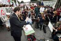 El director Arturo Rebolledo y los atrilistas de la Orquesta de C�ra de Bellas Artes, rodeados de campesinos FOTO Francisco Olvera