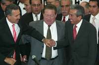 Los precandidatos pri�as Roberto Madrazo y Everardo Moreno en la sede nacional del PRI. Al centro, Rafael Rodr�ez Barrera, presidente de la Comisi�acional de Procesos Internos de ese partido FOTO Jos�arlo Gonz�z