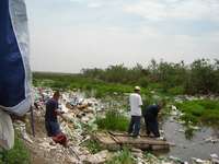 J�es improvisan una balsa para cruzar la laguna formada por los lixiviados de la basura en el tiradero Neza 1, predio donde se pretende construir un megaproyecto comercial FOTO Oscar Alvarado
