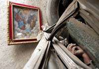 El cuerpo de un automovilista yace entre los restos de su veh�lo, que fue arrastrado hasta el interior de una casa por la pipa de gas que se volc�er en la carretera federal M�co-Puebla. En el percance el cami�rras�n otros seis automotores, con saldo de tres muertos y 10 heridos FOTO Alfredo Dom�uez
