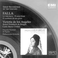 Para cerrar este círculo mágico, recomendamos aquí la que puede considerarse (aunque estos considerandos tienen toda la relatividad posible, incluyendo a la del mismísimo Einstein) como la mejor grabación existente de La vida breve, El amor brujo y El sombrero de tres picos (EMI Classics) con la voz de la angelical Victoria de los Angeles (1923-2005), que es sin duda alguna un ángel.