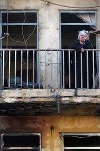 Una mujer observa desde el balc�e su casa, da� por los constantes ataques en Bagdad, los restos de un auto que estall�rca de un restaurante en el este de la capital, que dej�atro muertos y siete heridos FOTO Ap