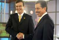 Los precandidatos del PRD al Gobierno del DF, Marcelo Ebrard y Jes�tega, se saludan antes de iniciar su debate de anoche durante el noticiario de Adela Micha en Televisa FOTO jose carlo gonzalez