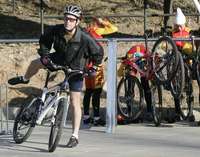 George W. Bush aprovech� estancia en Pek�para hacer deporte, ayer, en compa�del equipo ol�ico de ciclismo de monta�hino FOTO Reuters