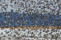 Una parvada cruza sobre Baicoi, Rumania. Este pa� que lucha contra brotes de gripe aviar, asiste a sus primeras nevadas del a�OTO Ap