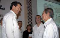 El director de prestaciones m�cas del Seguro Social, Onofre Mu�(centro), flanqueado por el gobernador de Yucat� Patricio Patr�aviada, y el presidente ejecutivo de la Fundaci�MSS, Jes�mate Rodr�ez, al t�ino de la clausura del 14 Foro Nacional de Investigaci�n Salud, en el que se anunci�e se reforzar�la educaci� la investigaci�orque son fundamentales en la mejora continua de los servicios m�cos