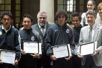 Con uniforme negro pasaron al frente a recibir un diploma, Efraín Juárez, Juan Carlos Silva, Pedro Valverde, César Villaluz, Enrique Esqueda y el técnico Jesús Ramírez, provenientes de las colonias Roma, Huipulco, Vergel, Guerrero, Educación y Tlalpan, respectivamente; "orgullosamente chilangos'', dijo un efusivo Encinas mientras recibía dos playeras de la selección nacional que le obsequiaron los jugadores.