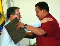El presidente colombiano, Alvaro Uribe, saluda al venezolano Hugo Ch�z tras suscribir los acuerdos para costruir un gasoducto y un poliducto FOTO Reuters