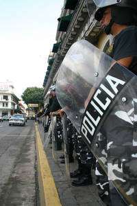 Granaderos del instituto de la Polic�Auxiliar de Xalapa (IPAX), instalados en la plaza Lerdo de esta ciudad para evitar plantones FOTO Carlos Tischler