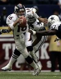 El quarterback de Broncos de Denver, Jake Plummer (izquierda), burla a la defensiva de los Vaqueros de Dallas FOTO Reuters