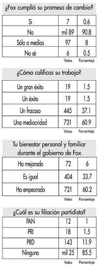 EL JUEVES DE LA próxima semana se cumplirán 5 años del presidente Fox y la señora Marta en el gobierno. La Constitución no prevé que el depositario del Poder Ejecutivo comparta poder y responsabilidad con su esposa. Sin embargo, Fox instauró por iniciativa propia un estilo de gobernar "en pareja". Resultados: su principal promesa fue la de llevar a cabo un cambio en la vida nacional. Falló, dice la abrumadora mayoría de los mil 199 mexicanas y mexicanos encuestados esta semana; el cambio no llegó. Además, 37 por ciento opina que el gobierno foxista constituye un fracaso, 61 por ciento lo califica como mediocre y menos de 2 por ciento lo califica como un éxito. El 60 por ciento siente que empeoró su situación personal y familiar. El 85 por ciento de los encuestados dijeron no pertenecer a ningún partido político.