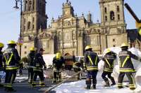 Elementos del cuerpo de Bomberos recogen las estructuras que se desplomaron cuando se realizaba una muestra gastron�a en la explanada del Z�o capitalino FOTO Roberto Garc�Ort�