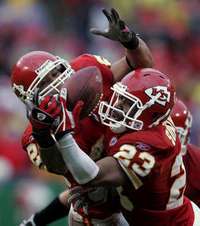 Sammy Knight y Patrick Surtain, de Kansas City, buscan controlar el bal�uego de una intercepci�OTO Ap
