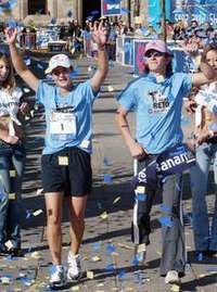La golfista Lorena Ochoa y la velocista Ana Guevara festejan el �to de la carrera a la que convocaron FOTO Notimex