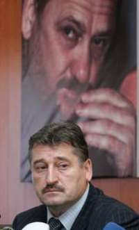 El presidente de Chechenia Alu Aljanov, durante una rueda de prensa ayer en Grozny. Al fondo, la imagen de Ahmad Kadyrov, gobernante checheno asesinado en 2004 FOTO Reuters