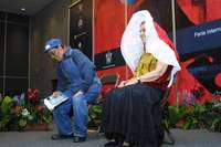 La directora esc�ca Jesusa Rodr�ez y la periodista Elena Poniatowska, vestidas de maquinista y tehuana, respectivamente, durante la presentacion de El tren pasa primero, nuevo libro de la colaboradora de La Jornada en el contexto del encuentro editorial de Guadalajara FOTO Arturo Campos Cedillo