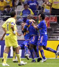 El americanista Cuauht�c Blanco observa el j� de los Tigres, que festejan la anotaci�e Julio C�r Santos (centro) FOTO Reuters