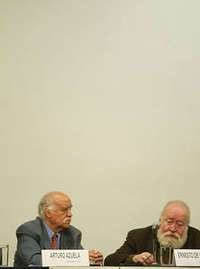 Arturo Azuela y Ernesto de la Pe�durante la presentaci�el libro FOTO Yazm�Ortega Cort�