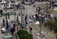 Rescatistas y polic� trabajan en la zona donde ayer un atacante palestino provoc� muerte de cinco israel� y dej� menos medio centenar de heridos al hacer estallar una bomba a la entrada de un centro comercial en la ciudad costera de Netanya FOTO Ap