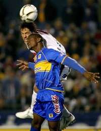El Guille Franco gan� esf�co al brasile�ulio C�r Santos, pero su remate peg� la horquilla de la meta felina FOTO Reuters