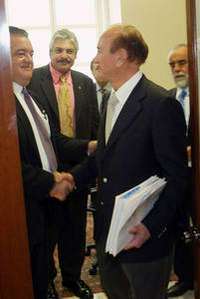 Los concesionarios de radio Rogerio Azc�aga y Roque Ch�z se despiden del legislador Erick Rubio al t�ino de una reuni�n el Senado FOTO Jos�arlo Gonz�z