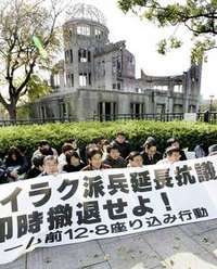 Pacifistas japoneses protestan en Hiroshima frente al Domo de la Bomba At�a por la decisi�el gobierno del primer ministro Junichiro Koizumi de extender la presencia militar de su pa�en Irak. A la derecha, polic� examinan los restos calcinados de un autob�acado ayer por un suicida en la estaci�e An Nahda, en pleno centro de Bagdad FOTOS Ap
