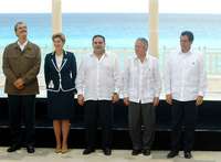 De izquierda a derecha, el presidente Vicente Fox; la ministra del Exterior de Colombia, Carolina Barco y los presidentes de El Salvador, Tony Saca; de Honduras, Ricardo Maduro, y de Panam� Mart�Torrijos, en la foto oficial luego de firmar el acuerdo energ�co regional en Canc�OTO Ap