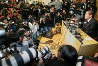 hwang Woo Suk, el controvertido cient�co sudcoreano se mantuvo firme en defender la autenticidad de sus resultados sobre c�las madres. En la imagen, Hwang es rodeado por periodistas durante la conferencia de prensa que ofreci�er en la Universidad Nacional de Se�TO Ap