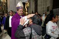 El cardenal Norberto Rivera Carrera al t�ino de la homil�de ayer en la Catedral Metropolitana. El prelado consider�a paradoja que en plena globalizaci�e intente criminalizar la migraci� se obstruya el libre tr�ito de las personas FOTO Cristina Rodr�ez
