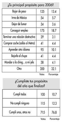 EL PROPOSITO PRINCIPAL para 2006 de 19 por ciento de 932 personas que encuestamos esta semana es conseguir empleo. En otras palabras: 20 de cada 100 personas de este grupo no tienen una ocupación remunerada. Es un indicador del alto nivel de desempleo que sufre el país. Cuando el gobierno habla de que es de 2 o 3 por ciento usa un mecanismo mañoso para confundir a la gente; la realidad es distinta. Otro indicador interesante tiene que ver con un problema que está alcanzando proporciones enormes: la obesidad. El 13 por ciento está preocupado por su peso, tiene el objetivo de quitarse unos kilos de encima comenzando el nuevo año. ¿Y de los objetivos del año que está por concluir? El 77 por ciento dice que cumplió unos y falló en otros. Un 11 por ciento merece estrellita en la frente y 12 por ciento debería sentir pena: admite que no cumplió ninguno.