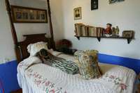 En un reducido cuarto, cuyo ventanal da al jardín, se aprecia la cama donde murió Kahlo. Una turista argentina murmura: "qué sencillez, para el monstruo de artista que fue". Sobre el lecho reposa la máscara mortuoria de Frida, realizada en bronce, cubierta por un rebozo, junto a la almohada que cobijó sus sueños y pesadillas, donde se lee la frase bordada: "no me olvides amor mío". La cama tiene un dintel con un espejo.