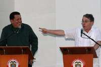 Los presidentes de Venezuela y Colombia, Hugo Ch�z y Alvaro Uribe, respectivamente, en imagen de hace unos d� durante una rueda de prensa en la provincia colombiana de Santa Marta, donde ambos mandatarios bromearon al ser interrogados sobre sus diferencias FOTO Ap