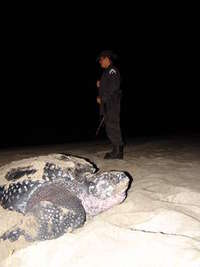 A las 4:15 de la madrugada la tortuga de 1.5 metros de largo deja un rastro hacia el mar y en la arena queda enterrada la esperanza de una especie que, sin la protección y la concientización del hombre, estará condenada a desaparecer.