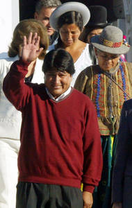 Detrás de Evo baja su comitiva, con la misma pinta informal. Mujeres de sombrero y traje autóctonos, jóvenes en chamarra, el líder sindical minero con casco y unos cuantos encorbatados. Rostros morenos, tímidos y sonrientes, achicando los ojos para sortear el sol de la mañana invernal.
