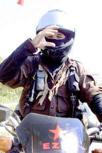 El delegado Zero a bordo de su motocicleta Sombraluz, en la carretera La Garrucha-Ocosingo, durante el arranque del periplo zapatista FOTO Victor Camacho