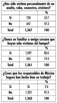 CINCO DE CADA 10 personas ha sufrido personalmente un robo, un asalto o un secuestro. De acuerdo a la antiencuesta que realizamos esta semana, el programa México Seguro implementado por el gobierno federal es un fracaso. De mil 367 personas, 720 dijeron que han sido víctimas en forma personal del hampa. Y todos -víctimas o no- expresaron que en su circulo íntimo ha sucedido algo lamentable: los familiares y amigos de mil 97 (de un universo de mil 361 personas) las ha golpeado la delincuencia en alguna de sus muchas formas.