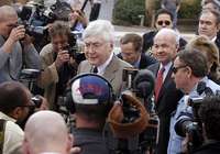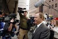 Rodeados por la prensa, los ex directores de Enron, Ken Lay y Jeffrey Skilling, en la foto derecha, salen de la corte federal de Houston en el primer día del juicio que también enfrentan por mentir sobre la posición financiera de la empresa