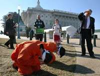 Miembros de El Mundo no puede Esperar, agrupación que se opone a la administración de George W. Bush, se manifestaron ayer frente al Capitolio donde simularon a prisioneros torturados