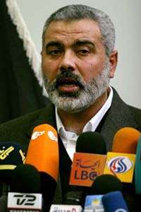 Hamas leader Ismail Haniyeh speaks during a news conference in Gaza City, Monday, Jan. 30, 2006. Hamas asked the international community on Monday not to cut aid to the Palestinians and called for dialogue with the West, as world leaders were meeting to discuss the fallout from the Islamic militant group's victory in elections last week. Haniyeh promised that foreign aid would go only toward helping ordinary Palestinians and said a Hamas government is ready to have its spending monitored. (AP Photo/Khalil Hamra)
