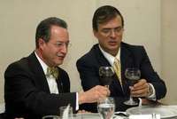 El presidente saliente del Colegio de Notarios del Distrito Federal, Alfonso Zermeño, y el candidato del PRD al GDF, Marcelo Ebrard, durante la comida con integrantes de ese gremio, ante quienes se comprometió a modernizar el Registro Público de la Propiedad