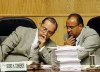 Sesión del IEDF en la que se debatió el tema de las irregularidades en que habrían incurrido el PRI y su candidata a jefa de Gobierno, Beatriz Paredes. En la imagen, el presidente del instituto, Isidro Cisneros, y el secretario ejecutivo, Oliverio Juárez