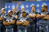 Acompañado de integrantes del equipo de Seattle, Matt Hasselbeck (centro) saluda a los aficionados