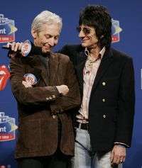Charlie Watts y Ron Wood, en una conferencia previa al Súper Tazón, el 2 de febrero