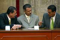 Ampliar la imagen El senador priísta Enrique Jackson y el secretario de Gobernación, Carlos Abascal, conversan con el gobernador de Durango, Ismael Hernández, durante la ceremonia conmemorativa del 89 aniversario de la Constitución Política Mexicana, acto realizado ayer en Palacio Nacional Foto: Marco Peláez