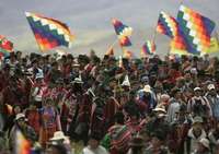 Thousands of indigenous people arrive to the archaeological remains in Tiawanacu, Bolivia, 40 miles outside of La Paz, Saturday, Jan 21, 2006 to attend a ceremony where President Elect Evo Morales will ask Andean gods for help and guidance on the eve of his inauguration as Bolivia's new president. (AP Photo/Ricardo Mazalan)