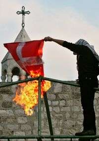 Un palestino quema una bandera de Dinamarca en la iglesia de la Natividad en Belén, en repudio a los dibujos satíricos del profeta Mahoma