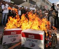 Jordanos queman productos daneses en Amman como parte de las protestas contra Dinamarca y otros países europeos que publicaron la imagen del profeta Mahoma en caricatura