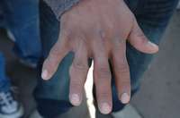 Uno de los trabajadores muestra sus articulaciones inflamadas. Otros se quejan de dolores y lesiones por trabajo excesivo