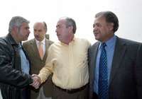 El dirigente del PT, José Narro; el secretario general de Convergencia, Alejandro Chanona; el presidente nacional del PRD, Leonel Cota, y el líder petista, Alberto Anaya, durante la reunión de ayer en la casa de campaña de la alianza Por el Bien de Todos